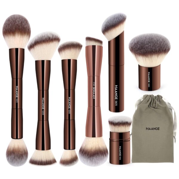 - MAANGE 7-piece Makeup Brush Set Includes: 4 double-ended kabuki brushes, 1 angle foundation brushes, 1 Loose powder brushes, 1 blush brush, a Velvet Bag